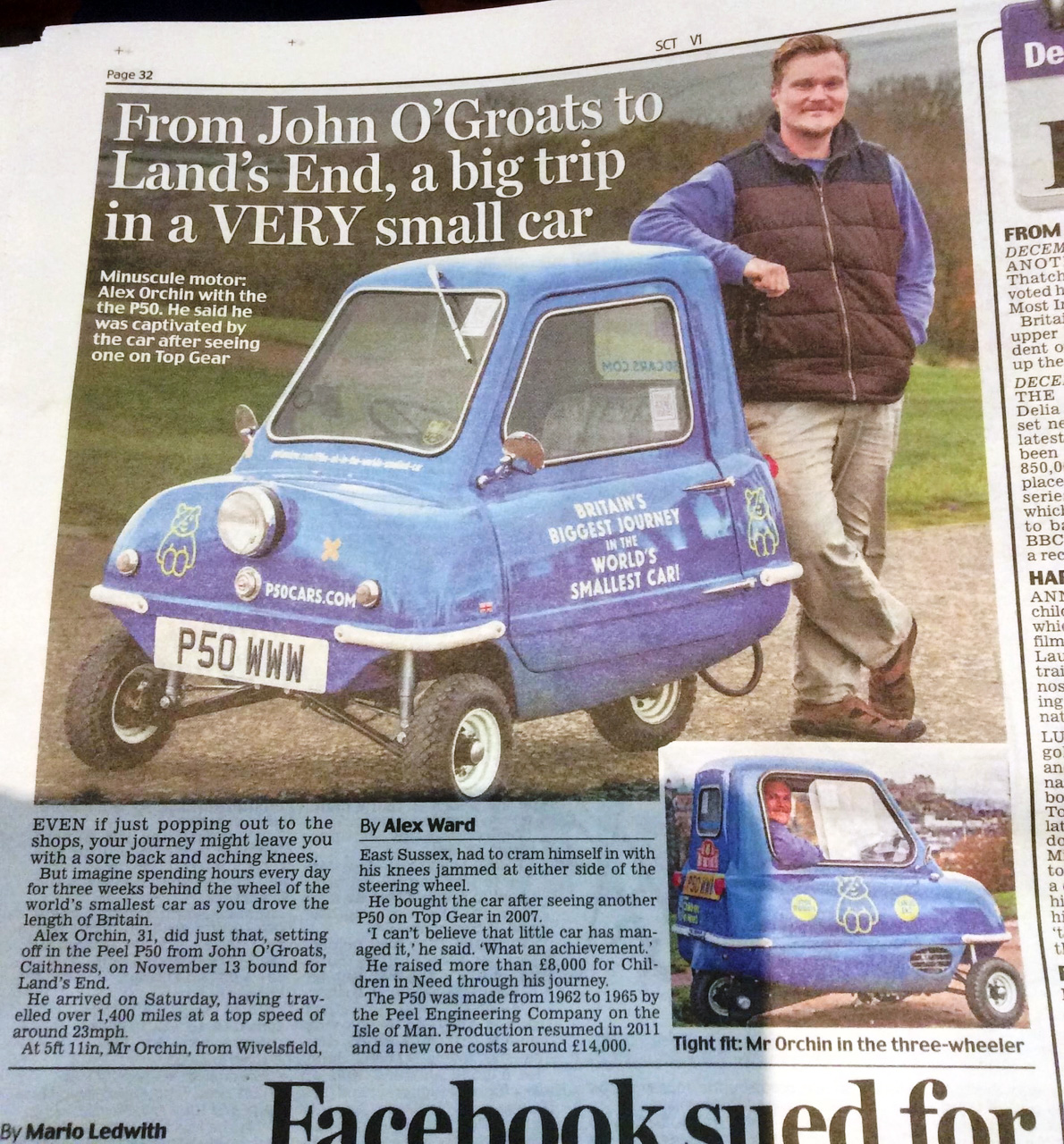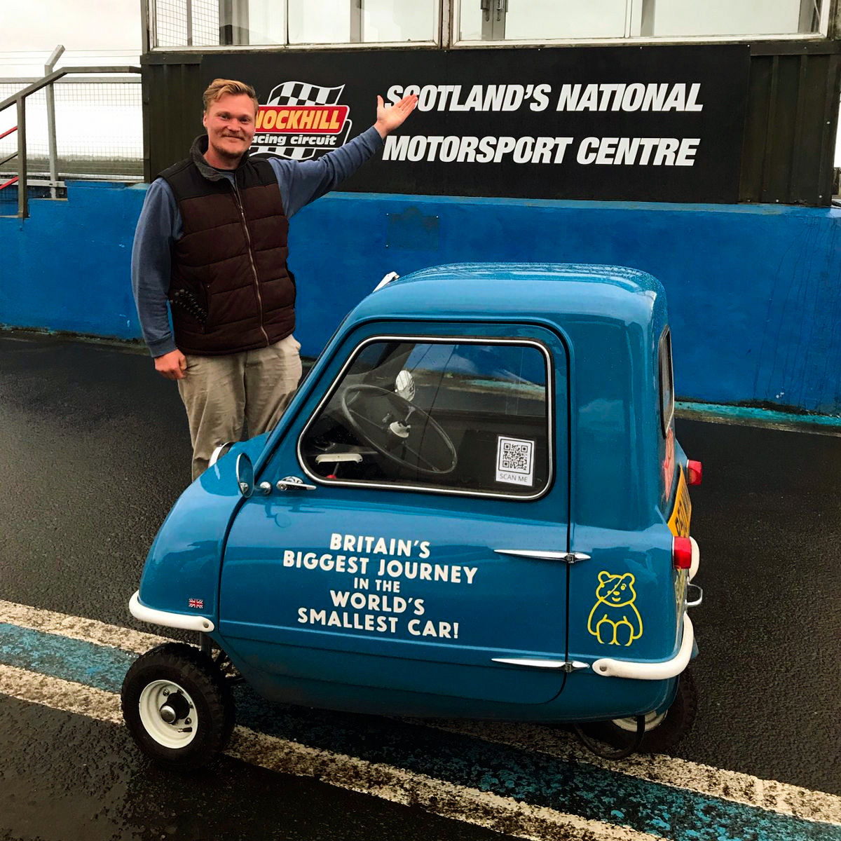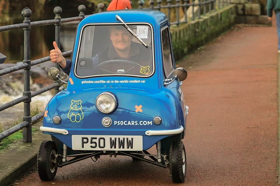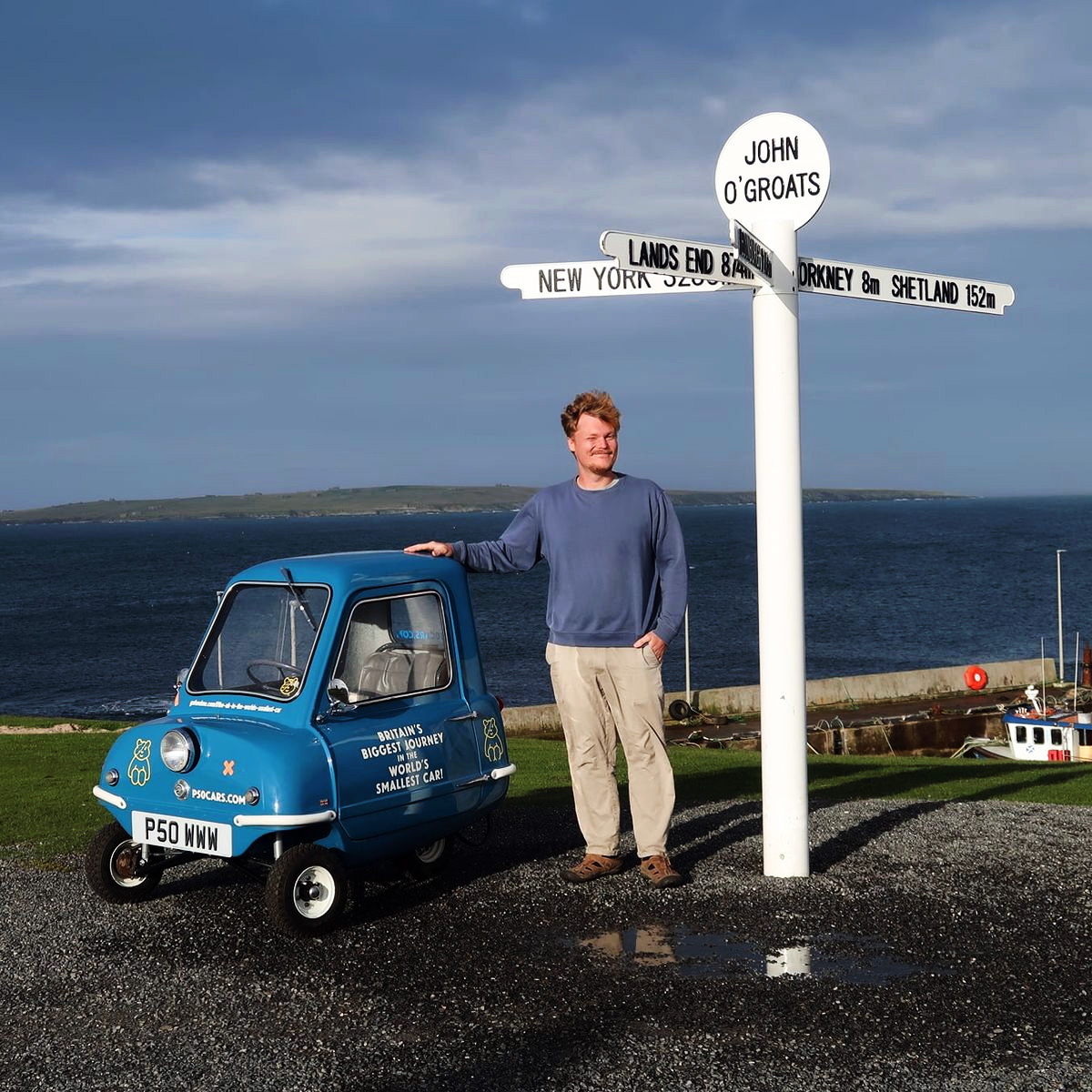 In the winter of 2021, Alex took on an audacious charity challenge: driving the length of Britain in the world’s smallest production car. Setting off from John O’Groats in the far north of Scotland and finishing at Land’s End in the south west of England, Alex covered almost 1,600 miles over three weeks. With support from his friend Joely following in a camper van, the tiny P50 proved it was capable of far more than anyone expected.